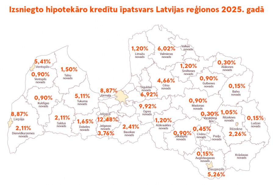 Vienlaikus vairāki Latgales un atsevišķi Vidzemes novadi joprojām uzrāda zemāku aktivitāti, ko ietekmē gan lēnāks jauno projektu piedāvājums, gan zemāki mājsaimniecību ienākumi. Vismazāk hipotekāro kredītu šogad izsniegti Valkas, Ludzas, Varakļānu un Krāslavas novados.