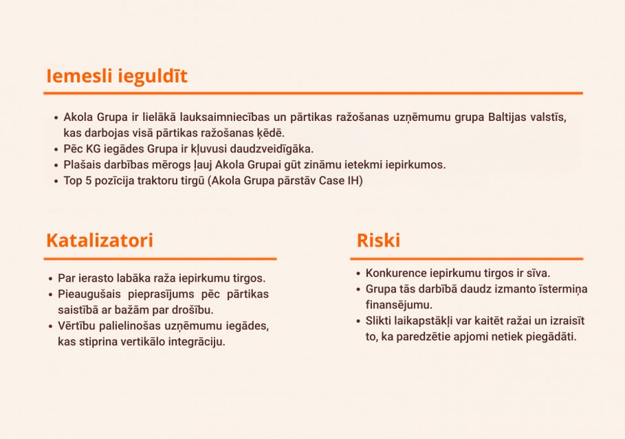 Kā norāda Akola, visās trijās Baltijas valstīs tika novākts gandrīz rekordliels ražas daudzums. Vienlaikus ražas novākšana aizkavējās, jo vasaras beigās bija daudz nokrišņu un zemākas gaisa temperatūras, kā rezultātā graudu kvalitāte bija zema. Tulkojam to tā, ka graudu tirdzniecības apstākļi reģionā ir tālu no ideāliem, un turpmāks cenu spiediens var apdraudēt milzīgos panākumus, ko Akola guva jūlijā–septembrī. Līdz ar to Grupa nolēma saglabāt savu prognozēto gada EBITDA diapazonu 70–90 milj. EUR apmērā, neraugoties uz spēcīgo sniegumu 1. ceturksnī.