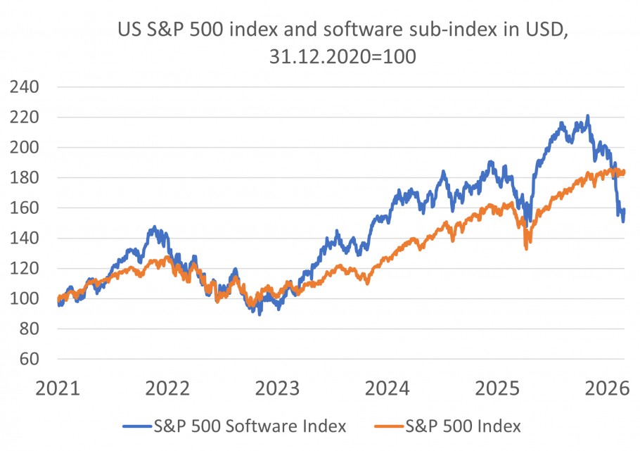 Lielāko daļu februāra investoru uzmanības centrā bija vēl viens svarīgs jautājums – MI potenciāls radīt satricinājumus ierastajā lietu kārtībā. Pagājušā gada beigās bažas bija saistītas ar milzīgajiem ieguldījumiem MI jomā un to, vai tie atmaksāsies un nesamazinās turpmāko brīvo naudas plūsmu, taču jaunākās bažas ir par iespējamiem strukturālajiem zaudētājiem MI revolucionāro tehnoloģiju rezultātā. Programmatūras uzņēmumu akcijas, kas veido aptuveni ceturto daļu no ASV S&P 500 IT indeksa, skāra pārdošanas vilnis tādēļ, ka to biznesa modeļi varētu kļūt neatbilstoši laikmetam, kamēr MI tehnoloģiju spējas strauji attīstās (sk. grafiku). Tomēr uzņēmumi, kas kontrolē pašu datus vai to izplatīšanu, kam pieder mākoņtehnoloģiju infrastruktūra vai kas ir kļuvuši par klientu darbplūsmu neatņemamu sastāvdaļu, šķiet pasargātāki un varētu gūt labumu no MI tehnoloģiju pienācīgas integrēšanas (piemēram, Microsoft, Google, Oracle un Meta). Šajā kontekstā ieguldījumi MI tehnoloģijās drīzāk ir nepieciešams priekšnoteikums konkurētspējas saglabāšanai. Galvenie ieguvēji tirgus norisēs saistībā ar MI potenciāli radītajiem satricinājumiem tehnoloģiju pusē ir bijuši aparatūras ražotāji, tostarp pusvadītāju ražotāji Āzijā, kas ir veicinājis attīstības valstu tirgus indeksu uzrāvienu.
