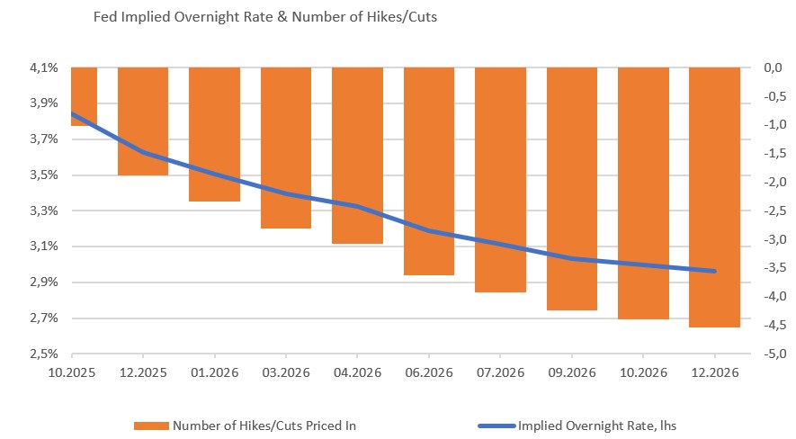 Mēneša grafiks: Tirgus prognozē, ka Federālo rezervju sistēma līdz gada beigām samazinās procentu likmes divas reizes, nosakot bāzes likmi ap 3,6%, un līdz 2026. gada beigām tās samazinās vēl 4–5 reizes, līdz aptuveni 3%.