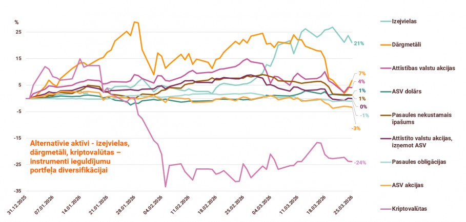 Apskatīsim, kādu dinamiku augstas ģeopolitiskās nenoteiktības apstākļos uzrādīja alternatīvie aktīvi: dārgmetāli, kriptovalūtas un izejvielas.