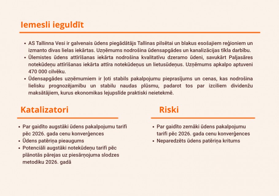 Tā kā EBITDA kritumu enerģētikas segmentā un EBITDA pazemināšanos kuģniecības segmentā daļēji kompensē EBITDA pieaugums citos komercdarbības virzienos, samazinām 2026. gada prognozēto koriģēto EBITDA par 6% līdz 264 milj. EUR (no 280). Tajā pašā laikā mūsu ilgāka termiņa prognozes par EBITDA mainās minimāli. Palielinām mūsu pēc SOTP (daļu summēšanas) metodikas aprēķināto mērķa cenu no 42 EUR līdz 45 EUR, kas atspoguļo līdzīgu uzņēmumu rādītāju pieaugumu enerģētikas segmentā un nekustamā īpašuma vērtības palielināšanos. Mūsu mērķa cena nozīmē, ka Grupas novērtējums atbilst 2026. gada prognozējamajam EV/EBITDA (uzņēmuma vērtība/peļņa pirms procentiem, nodokļiem, nolietojuma un amortizācijas) koeficientam 6,7x apmērā un P/B (cena/bilances vērtība) koeficientam 1,0x apmērā. Paturam spēkā neitrālu ieteikumu.