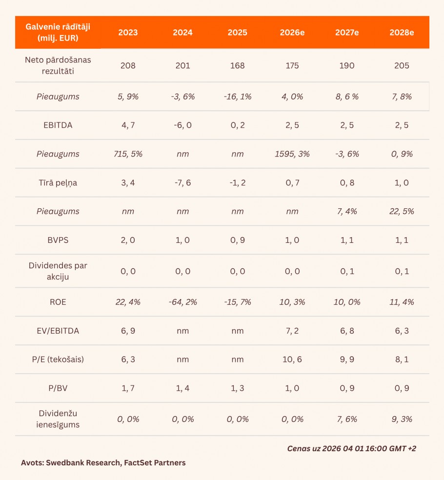 Paturam spēkā mūsu prognozes par 2026. gada ieņēmumiem 175 milj. EUR apmērā, kas nozīmē aptuveni 4% pieaugumu salīdzinājumā ar pagājušo gadu jeb atbilstoši Grupas plānotajam. Vienlaikus 2026. gada paredzamo EBITDA samazinām par 6% līdz 2,5 milj. EUR (no 2,7) un tīro peļņu – par gandrīz trešdaļu līdz 0,7 milj. EUR (no 1,1) galvenokārt saistībā ar mūsu ienesīguma pieņēmumu pazemināšanu. Pēdējais atspoguļo nelabvēlīgo apstākļu kombināciju, ko veido sīva konkurence, dārgāki pārvadātāju pakalpojumi un trausla finanšu situācija. Vājāku prognožu dēļ pazeminām mūsu mērķa cenu līdz 1,0 EUR (no 1,4), līdz ar to Grupas novērtējums atbilst 2026. gada paredzamās EV/EBITDA (uzņēmuma vērtība / peļņa pirms procentiem, nodokļiem, nolietojuma un amortizācijas) koeficientam 7,8x apmērā un P/E (cena/peļņa) koeficientam 11,3x apmērā. Paturam spēkā neitrālu ieteikumu.