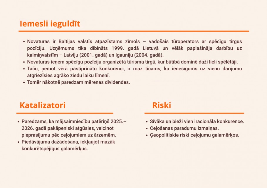 2025. gadā Grupa uzrādīja EBITDA 0,4 milj. EUR apmērā un tīros zaudējumus 1,2 milj. EUR apmērā, nesasniedzot savus mērķa diapazonus – attiecīgi 1,1–1,6 milj. EUR un 0–0,5 milj. EUR. Šo mērķu nesasniegšanu saistām ar pastiprināto konkurenci rudens sezonā un traucējumiem Viļņas lidostā (kas radās nelikumīgas robežu šķērsošanas dēļ, izmantojot bezpilota gaisa balonus; tas samazināja pieprasījumu pēc pēdējā brīža ceļojumiem). 2026. gadā Novaturas plāno saglabāt savu tūrisma programmu tādā pašā vai nedaudz augstākā līmenī nekā pagājušajā gadā. Paredzam, ka gaidāms vēl viens izaicinājumiem pilns gads.