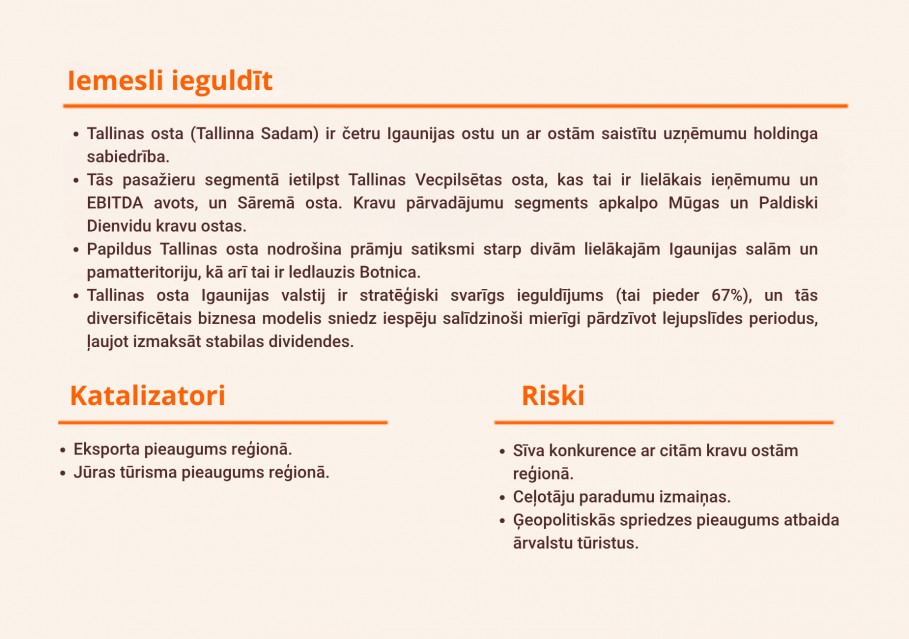 Veicam nelielas izmaiņas mūsu prognozēs par 2026. un 2027. gadu. Paturam spēkā 1,35 EUR mērķa cenu, taču, ņemot vērā pēdējā laika pieaugumu, mainām ieteikumu uz neitrālu. Mūsu noteiktā mērķa cena nozīmē, ka Tallinas ostas novērtējums atbilst EV/EBITDA (uzņēmuma vērtība / peļņa pirms procentiem, nodokļiem, nolietojuma un amortizācijas) koeficientam 8,1x apmērā un P/B (cena/uzskaites vērtība) koeficientam 0,9x apmērā, kamēr attiecīgie ilgtermiņa (neskaitot kovida pandēmijas periodu) vidējie rādītāji ir 8,9x un 1,1x. Sagaidām, ka Tallinas osta saglabās pēdējo trīs gadu DPS (dividendes par vienu akciju) 0,073 EUR apmērā, tādējādi nodrošinot 5,1% ienesīgumu.